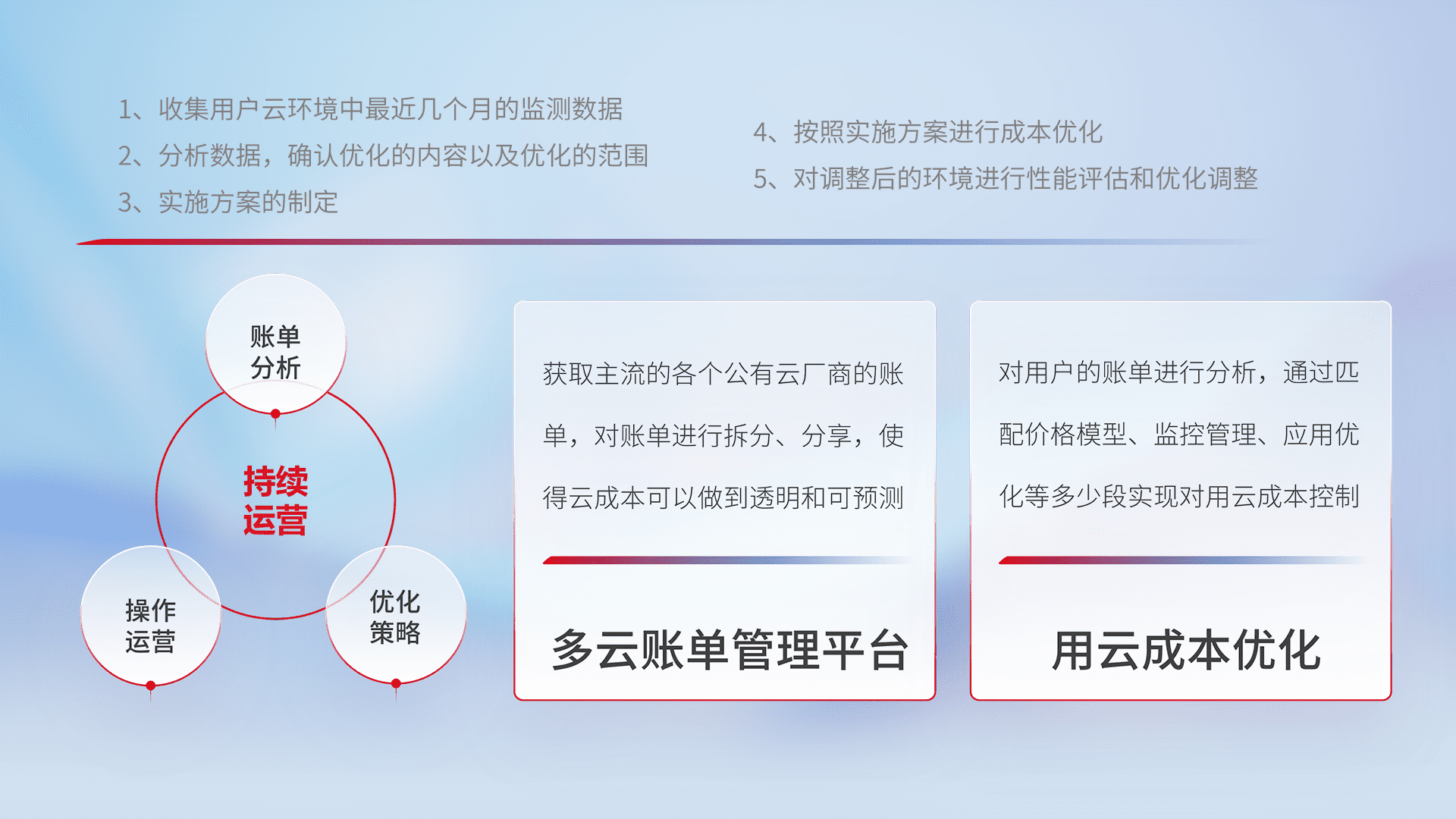 通过多云纳管,,,以统一的资源数据模型把客户的云资源进行抽象和封装,,,,进而实现对多云资源的统一操作,,,,保障云资源管理的可靠性、、、、稳定性与可用性。。。量身定制化运维内容,,,,配置、、开发运维、、、补丁管理、、、备份、、监控、、认证和访问管理、、、审计和日常巡检等,,,保障在用云过程中的可靠度,,,,稳定度以及高可用率。。。